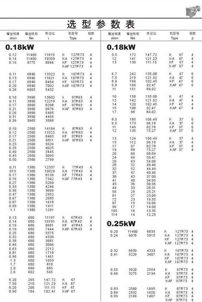 選型參數表0.18kW和0.25kW