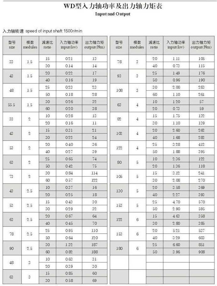 WD型入力軸功率及出力軸力矩表