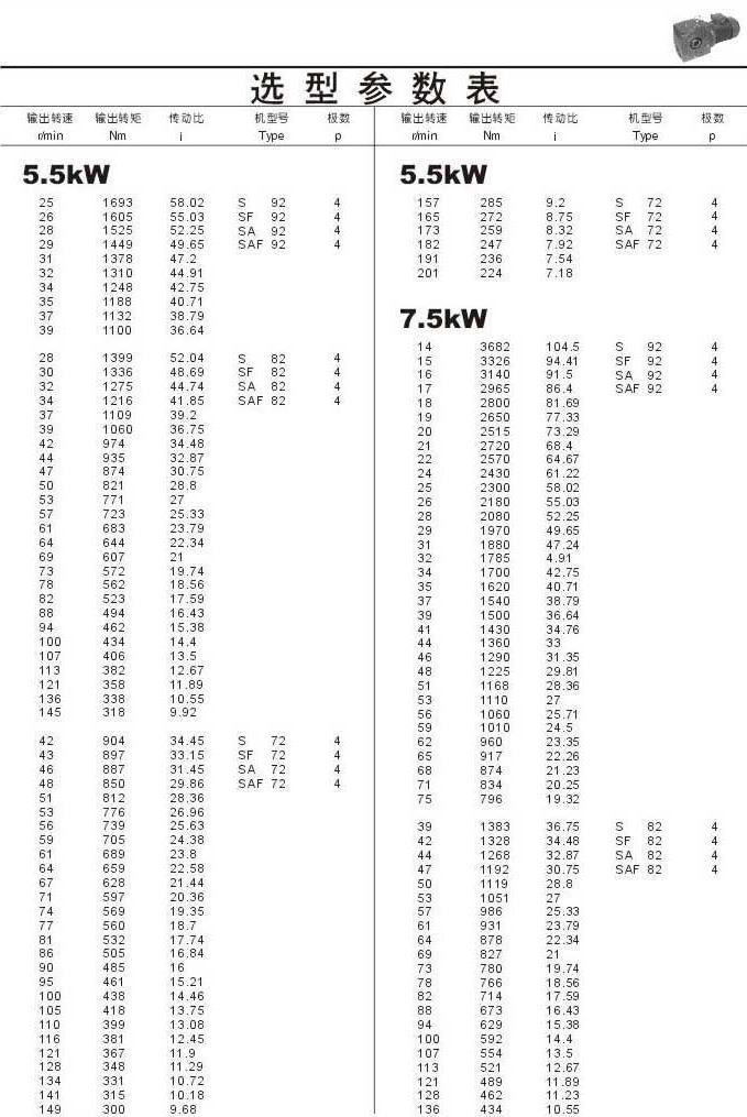 選型參數表5.5kW(續)和7.5kW